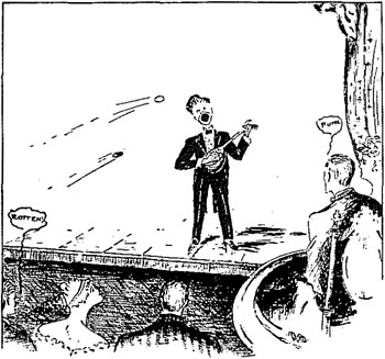 The club members distributed circulars around town in the evening and gathered back at the Opera House for an 8:30 PM performance. The club’s assistant manager recorded in his diary, “Packed house greets us with much applause and other decayed vegetables,” and later, “Audience refuses to appreciate some of our numbers sufficiently ‒ give encore, anyhow. Quartet appears on stage at the wrong time, slide silently out, but are seen.” Afterward, Luke Simons, the manager of the club, was asked if they had cleared expenses. He cleared his throat, but said nothing.